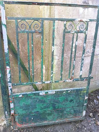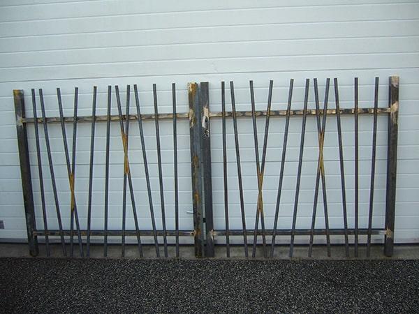Restauration d'un portail 2 vantaux. Sablage au four de l'ensemble, pose d'un festonnage en tôle et thermolaquage 2 couleurs